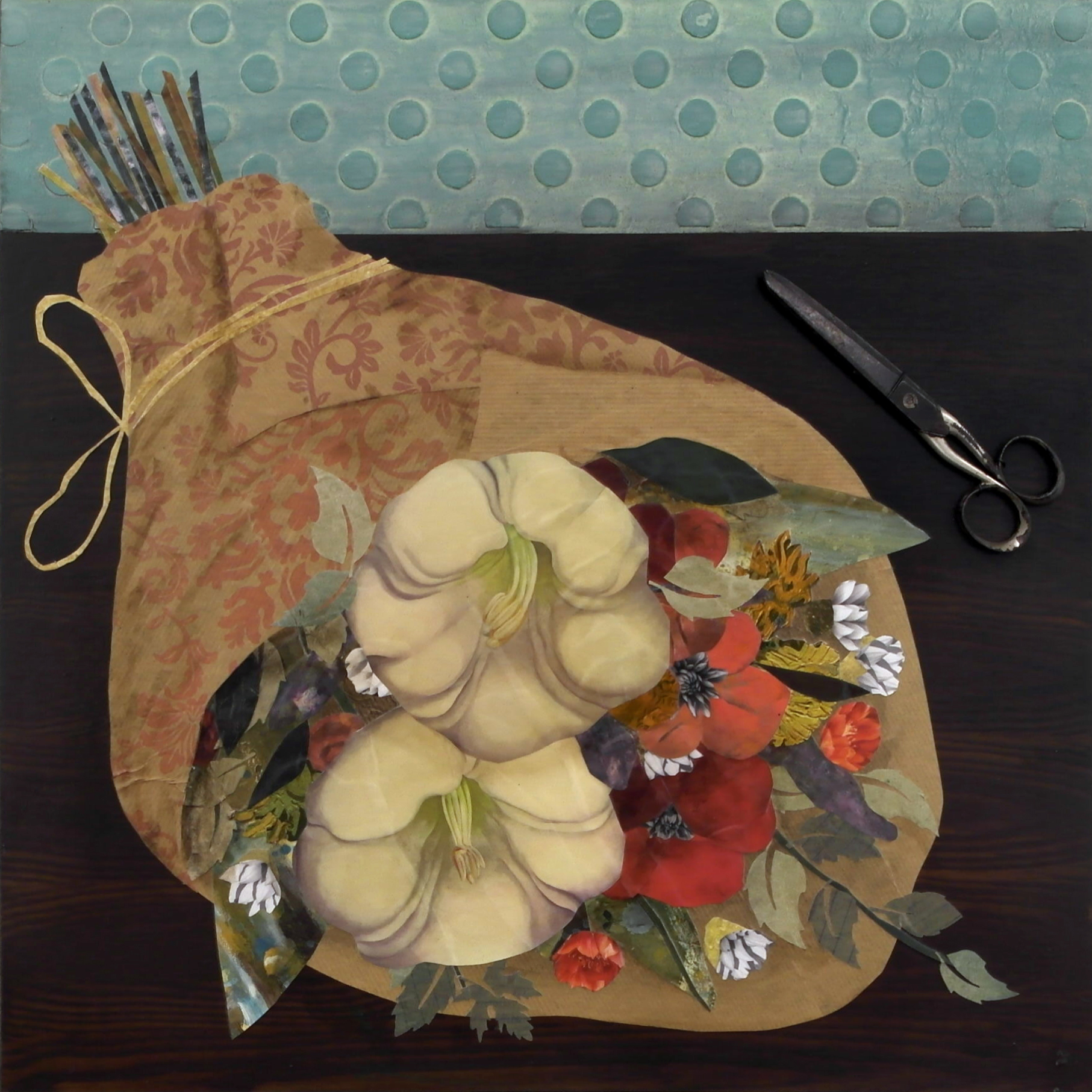 mixed media collage on wood panel20h x 20w in